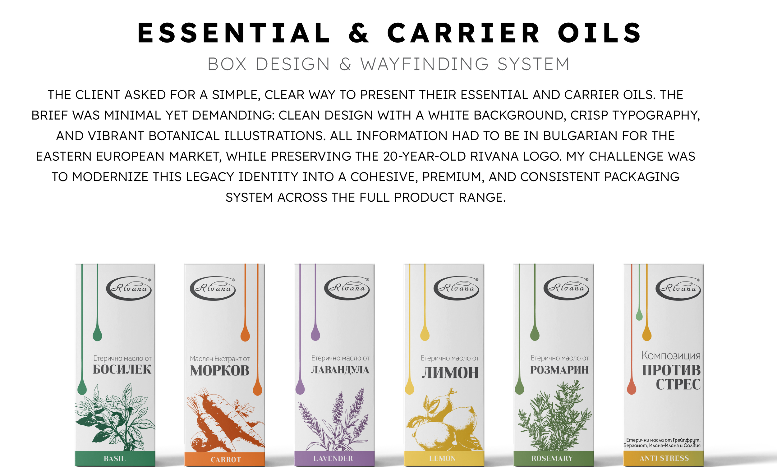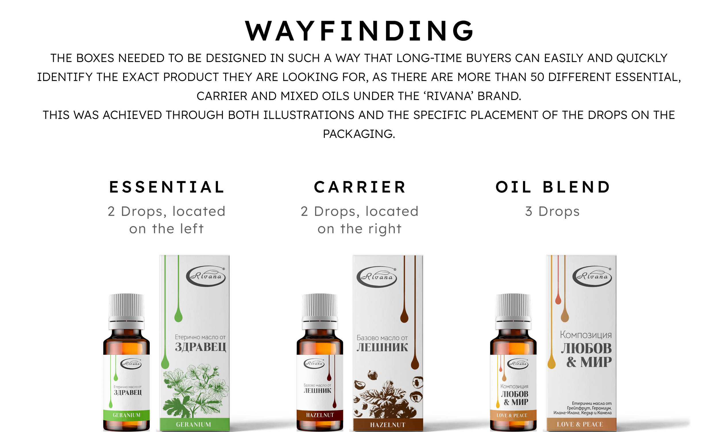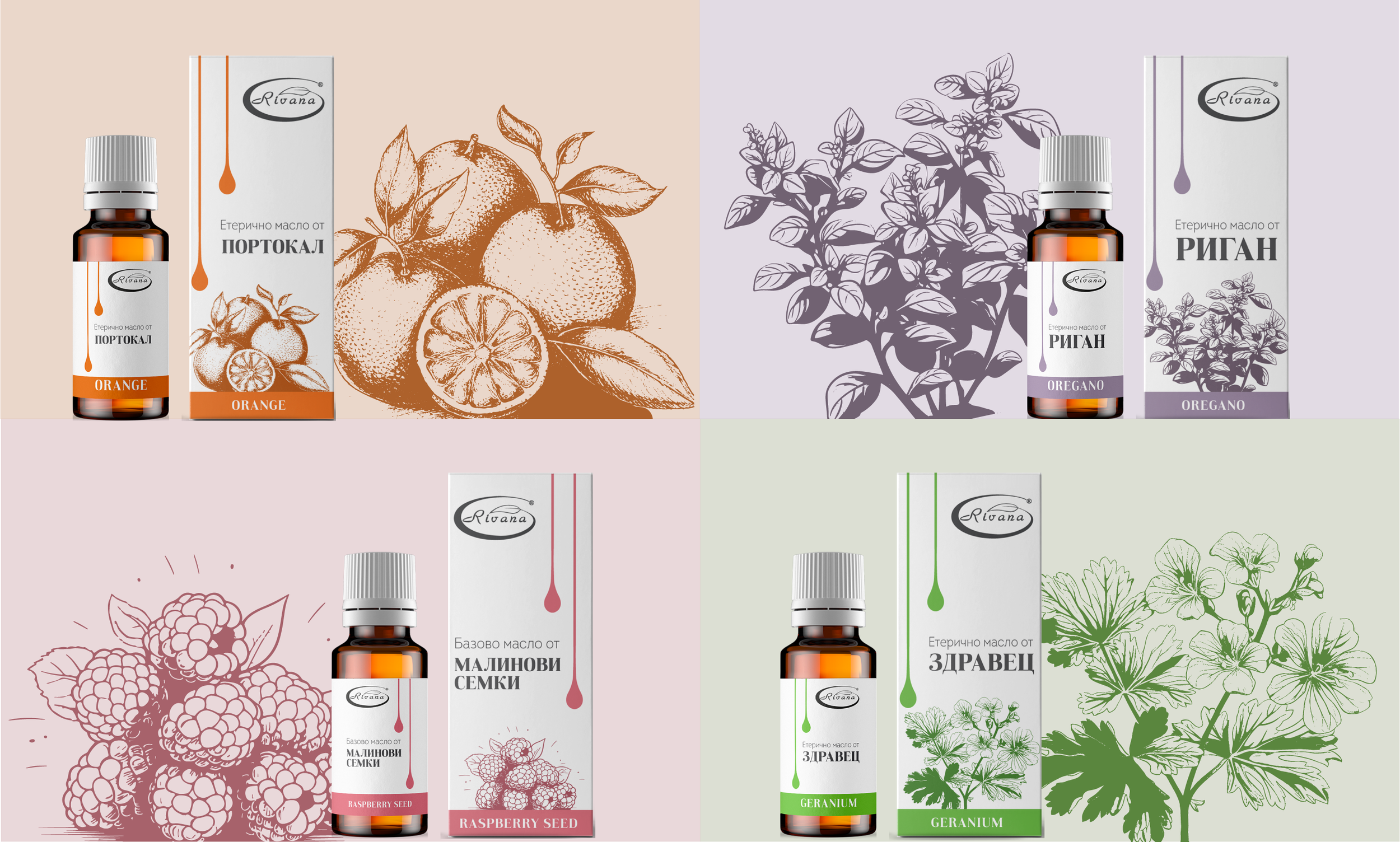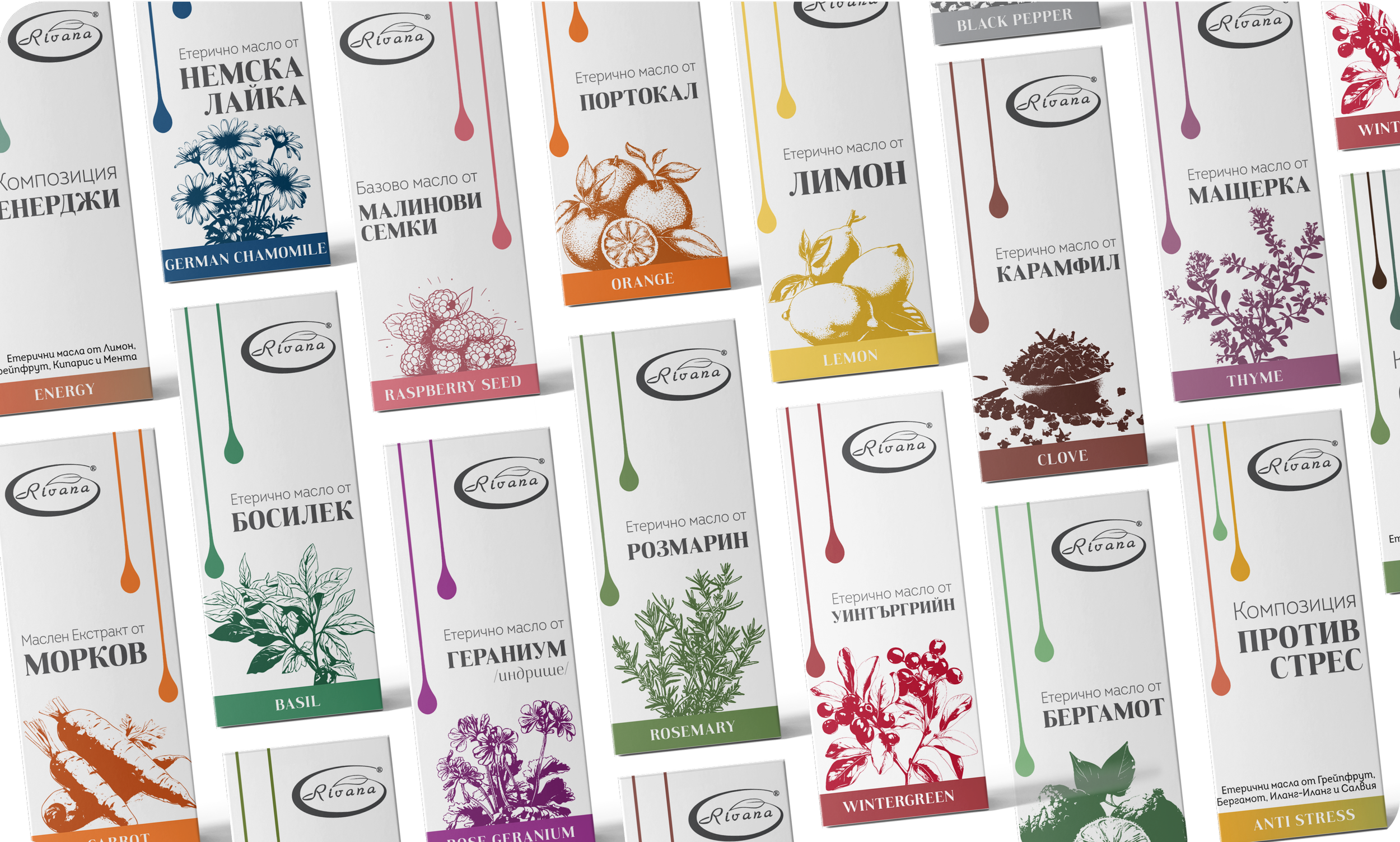 Series of Rivana essential and carrier oil boxes showing color-coded wayfinding system with botanical illustrations for basil, carrot, lavender, lemon, rosemary, and anti-stress blend.
