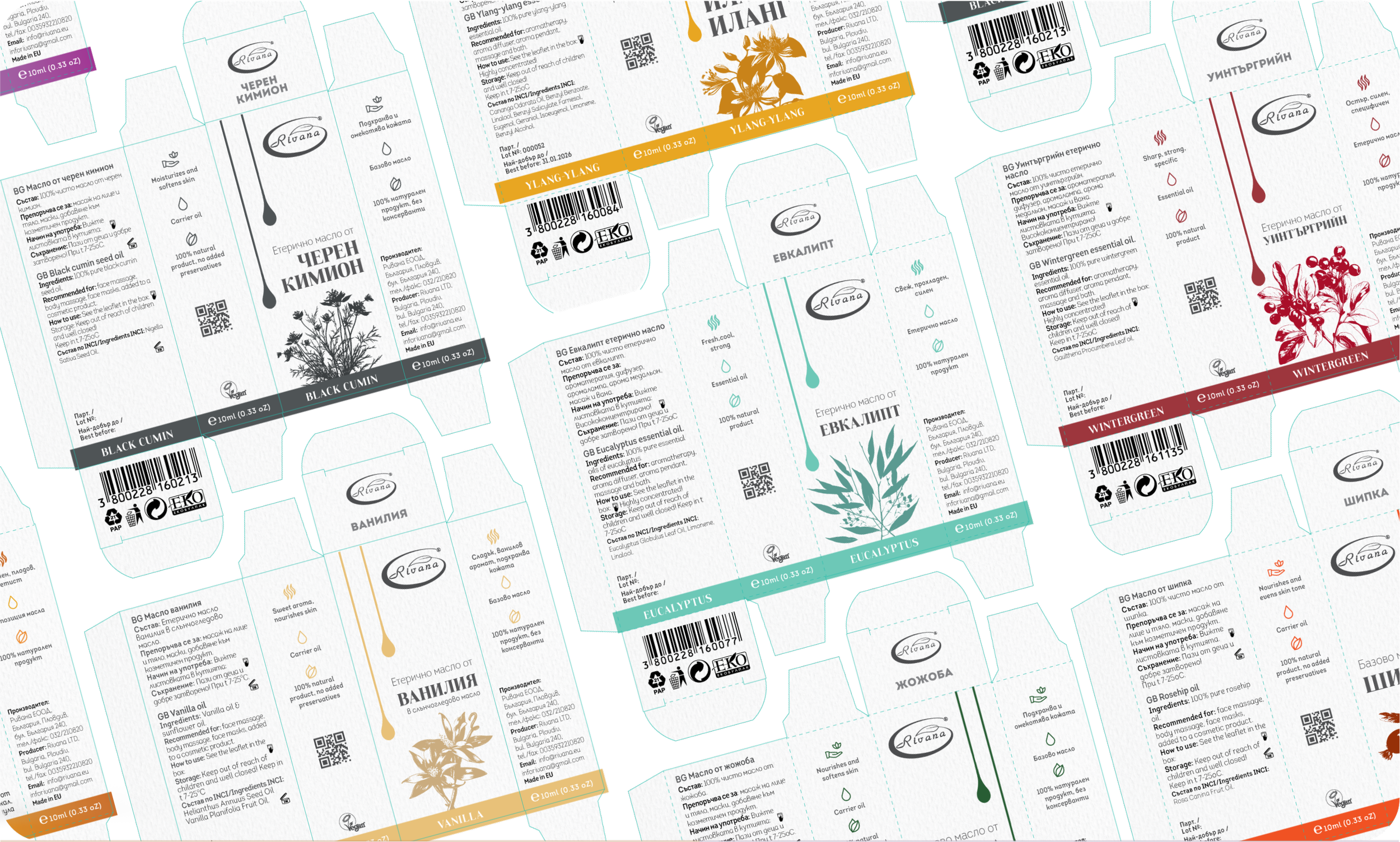 Collection of small product labels for essential oils featuring various scents such as black cumin, vanilla, eucalyptus, wintergreen, and juniper. The labels include product information, ingredients, barcode, QR code, and branding elements.