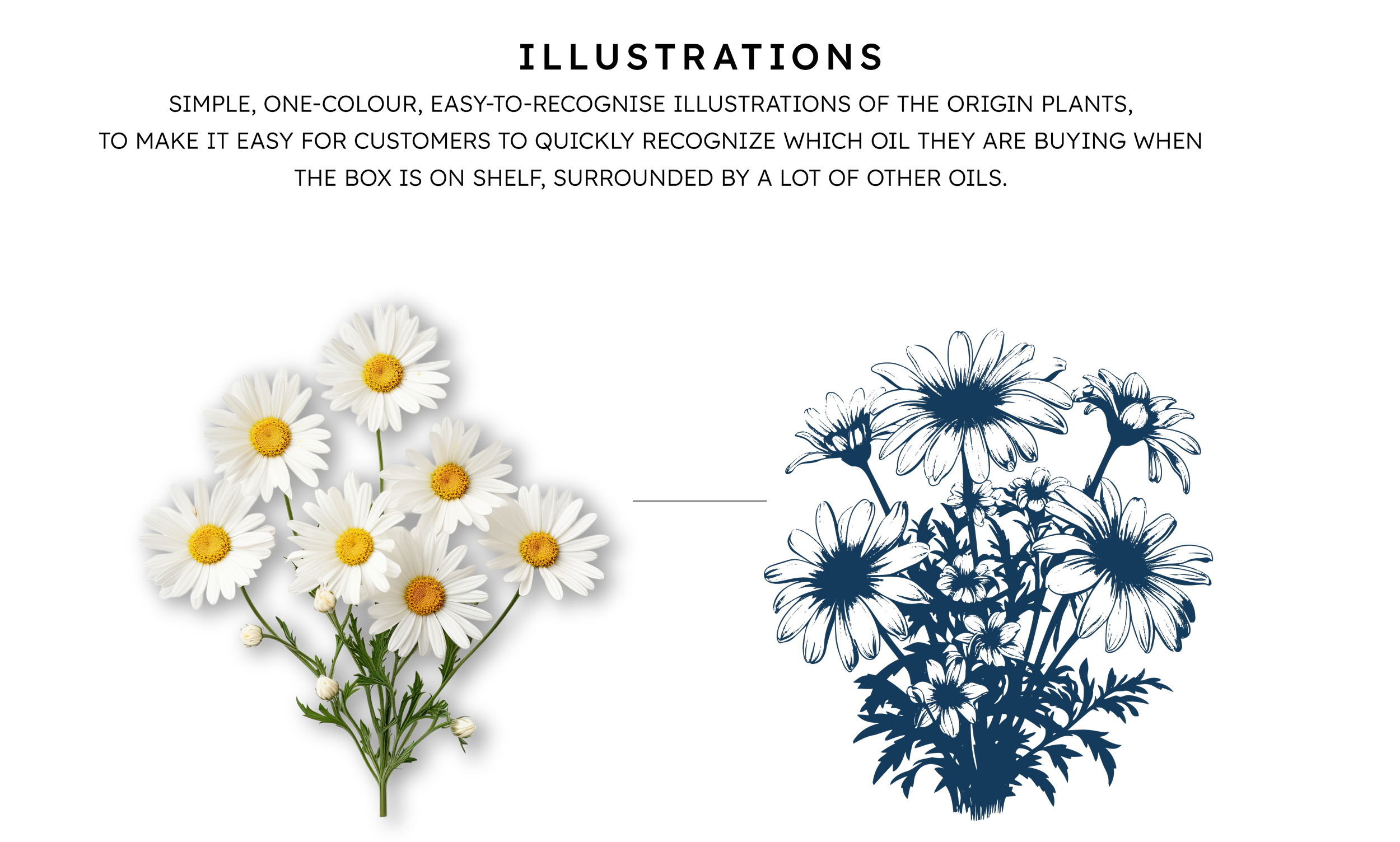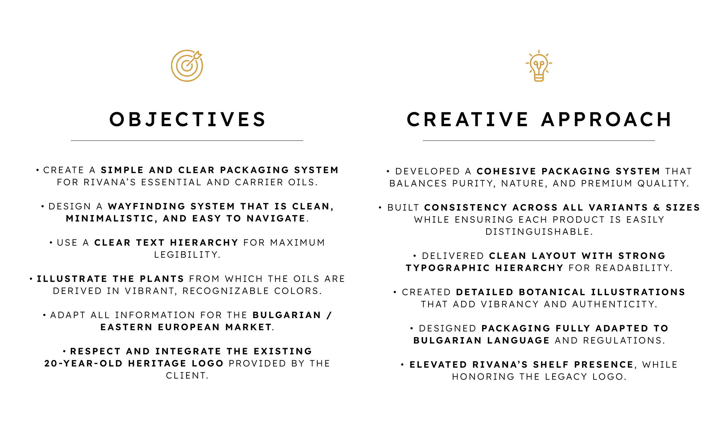 Infographic with icons explaining design objectives and creative strategy for Rivana essential oils packaging system.