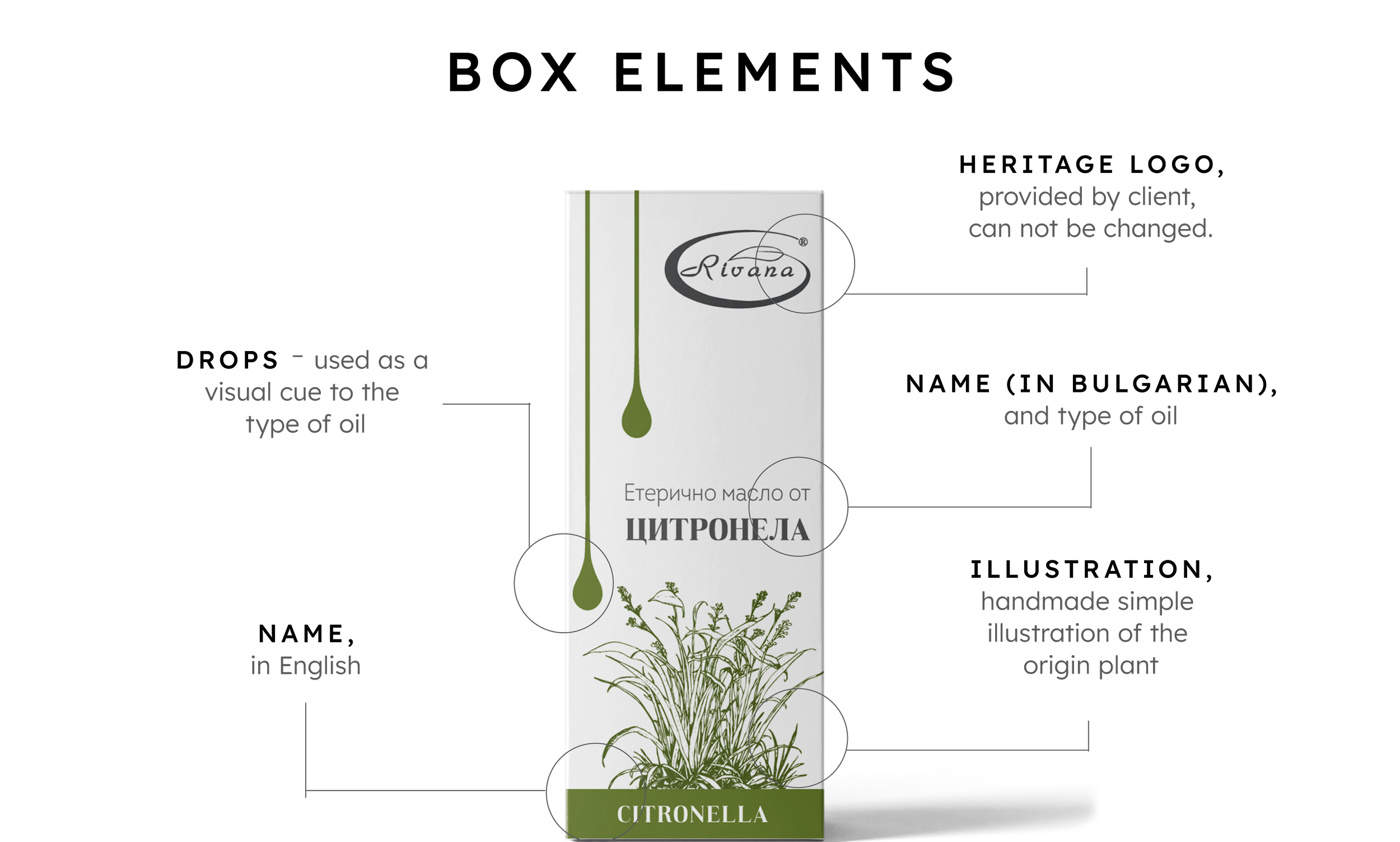 Citronella oil box design with callouts highlighting Rivana logo, Bulgarian typography, English translation, color drop visual cue, and hand-drawn botanical illustration.