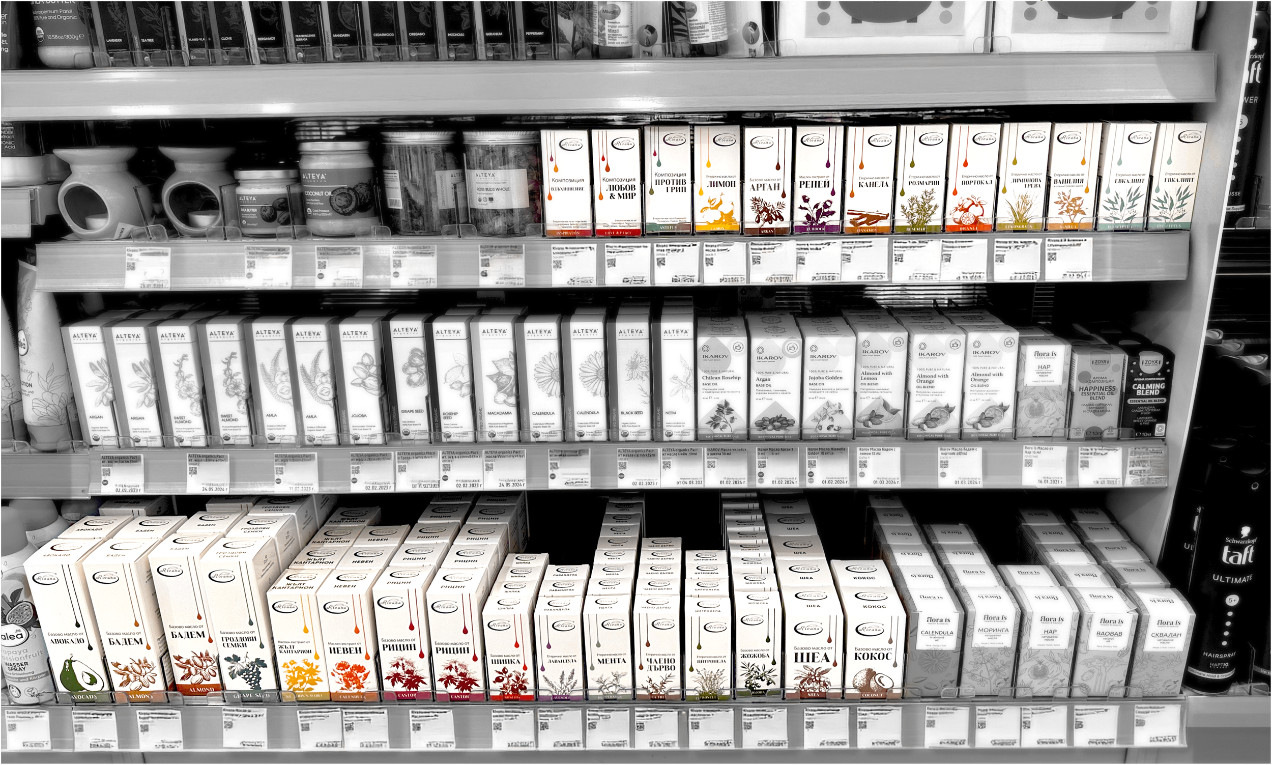 Geranium, hazelnut, and Love & Peace blend packaging showing visual drop system with variations for easy product differentiation.