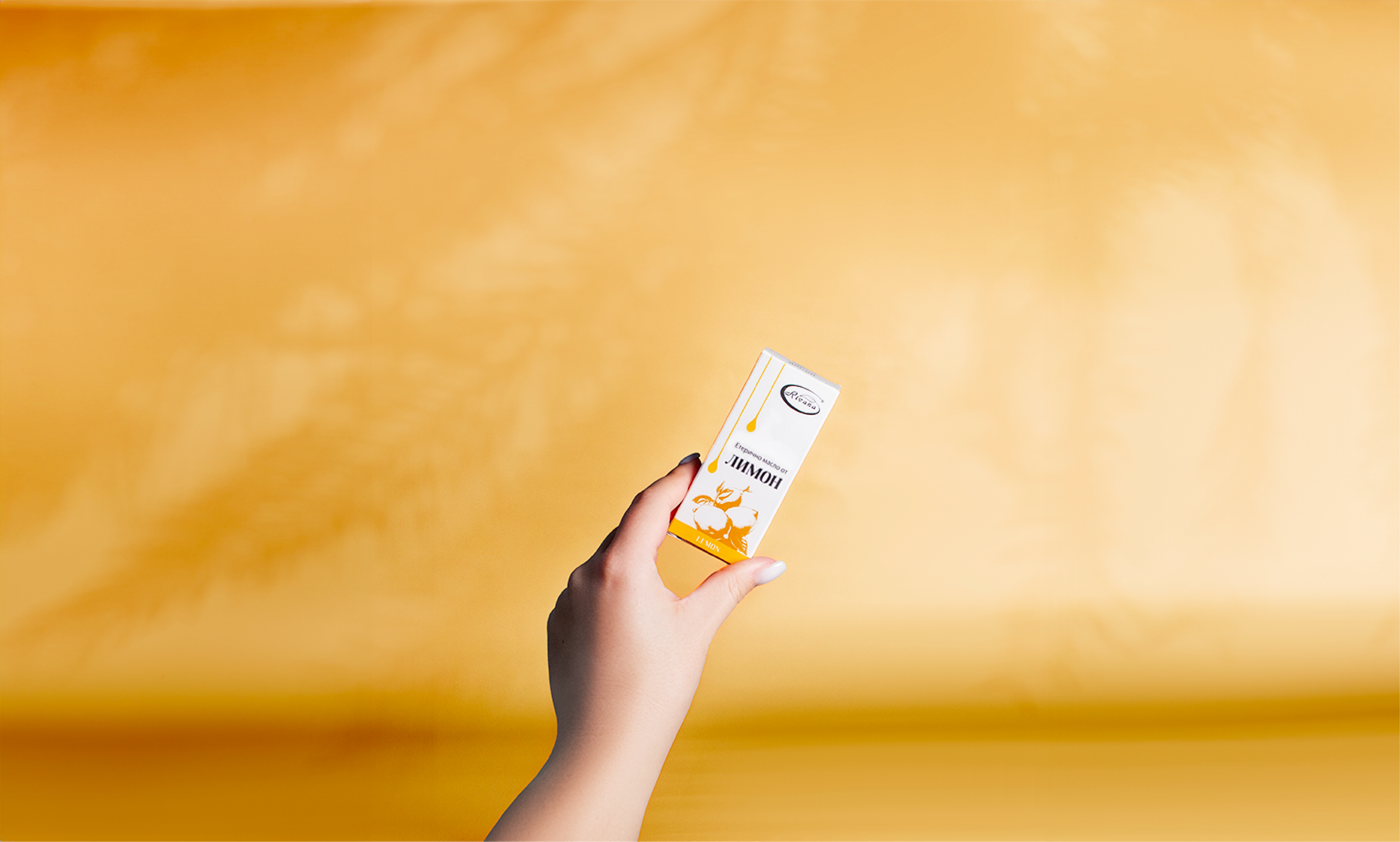 Four sets of essential oils and packaging, each with a different flavor and color theme: orange, oregano, raspberry seed, and geranium, with botanical illustrations in the background.